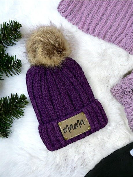 Purple Personalized Leather Patch Stocking Hat I Leather Patch Beanie I Leather Patch Ladies Winter Hat I Personalized Hat